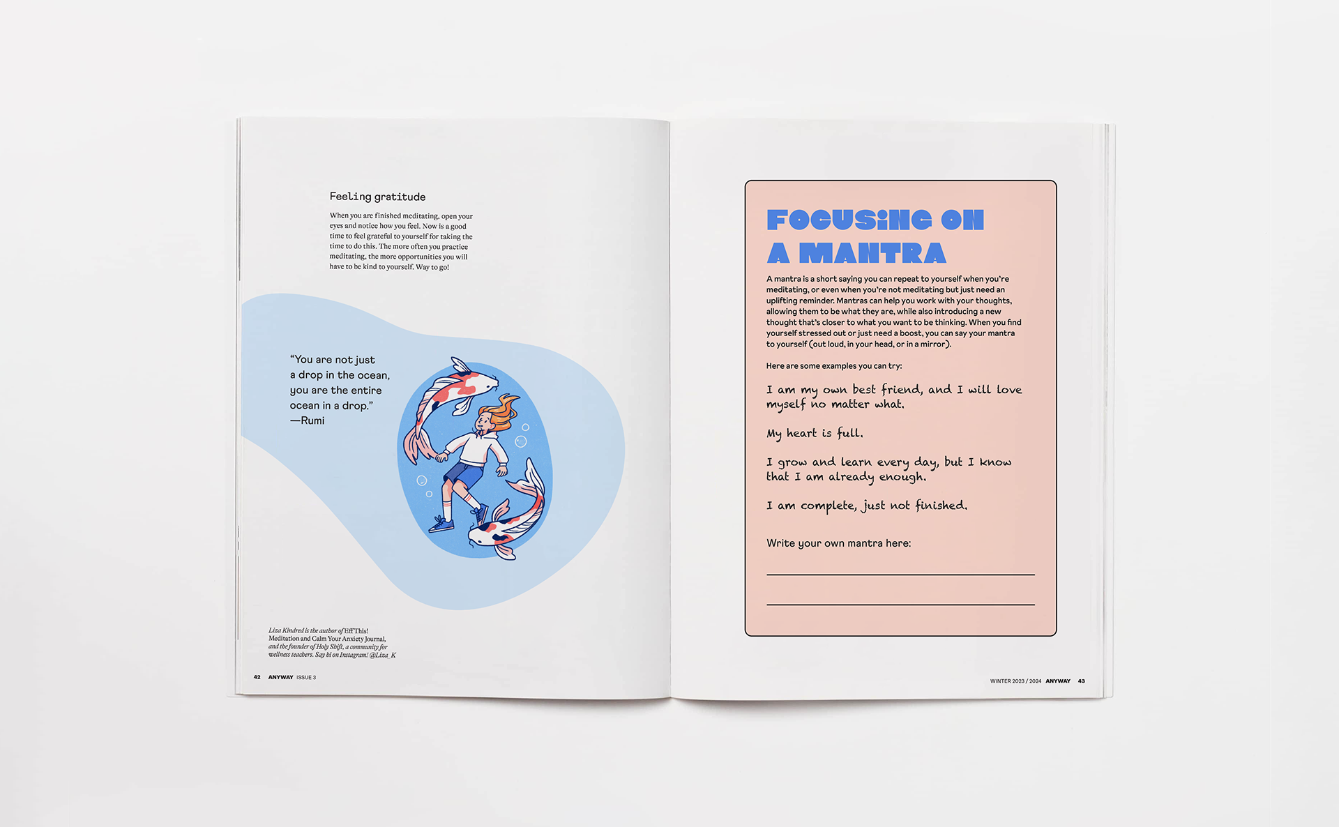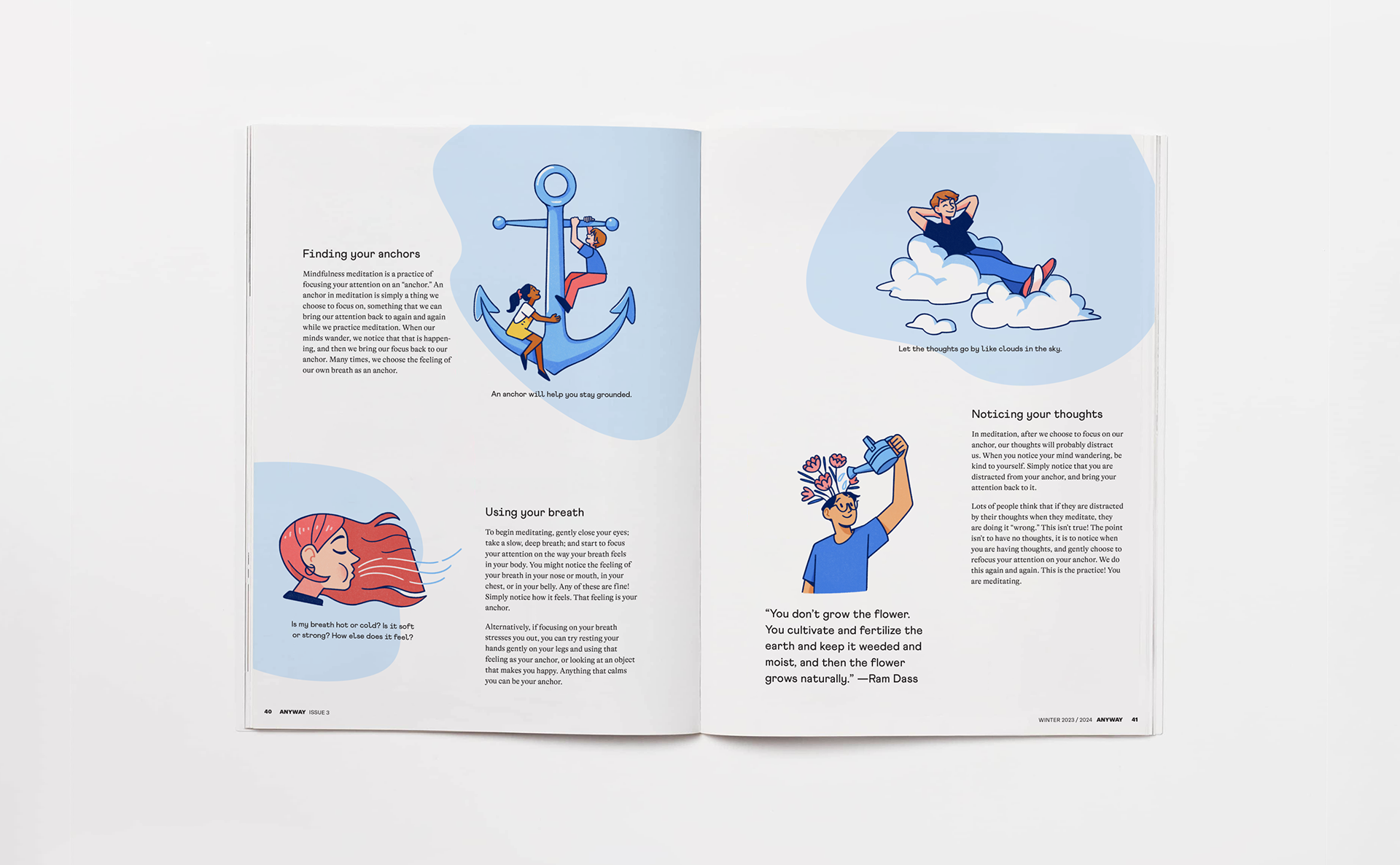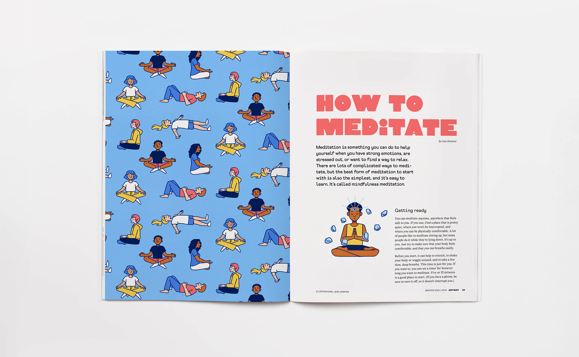 Spot illustrations and repeating pattern for an article about how to meditate. Anyway is a magazine for kids, aged 9-15, celebrating what it means to grow up.