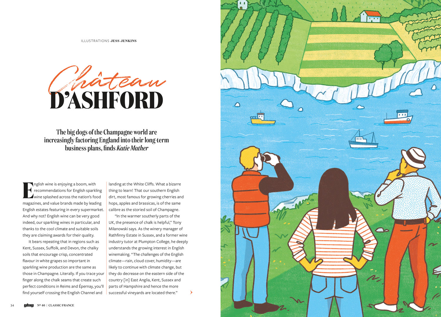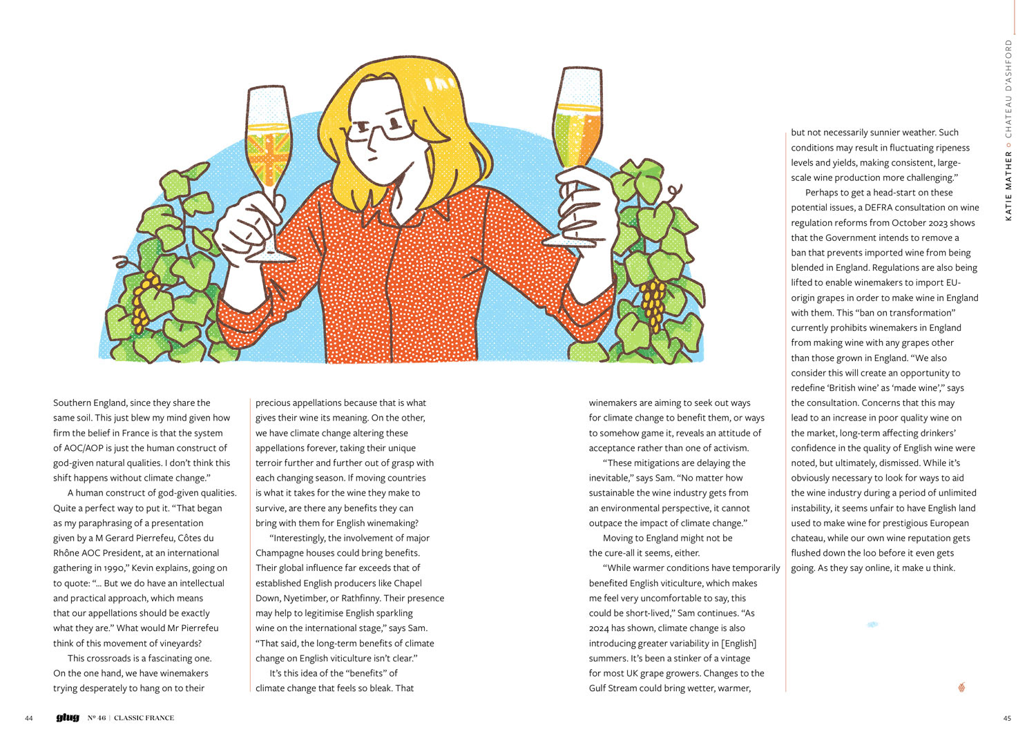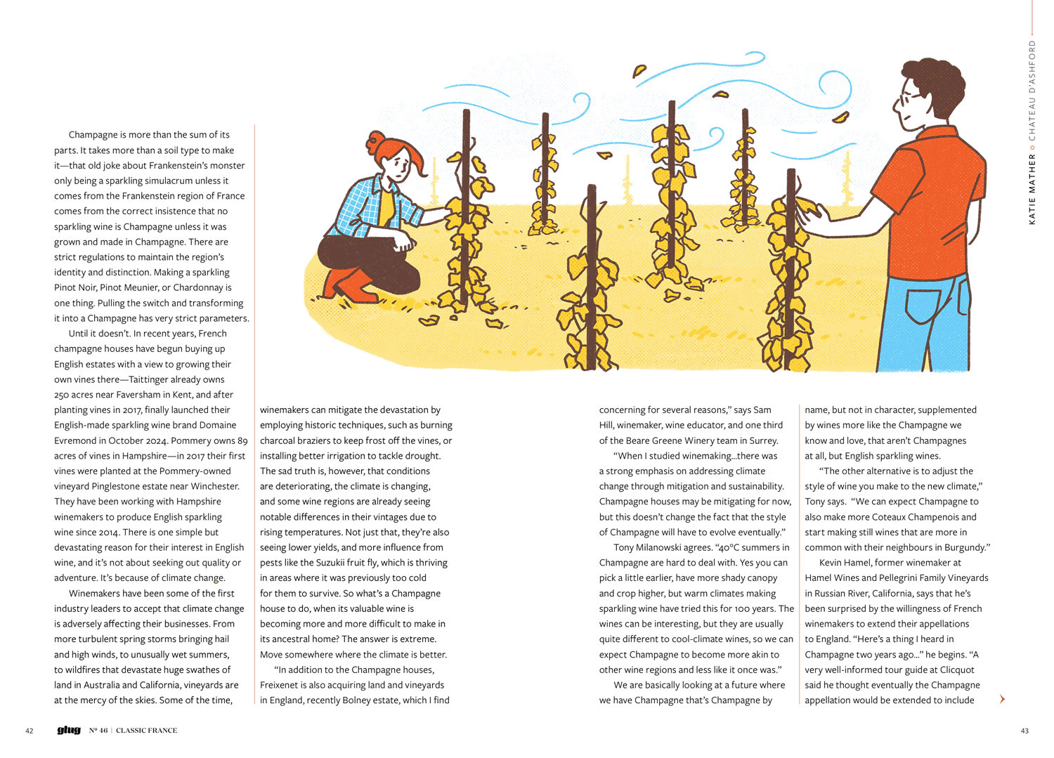 Illustrations for issue 46 of Glug Magazine by Beer 52. The illustrations accompanied an article describing how champagne makers are considering creating their sparkling wine in England.