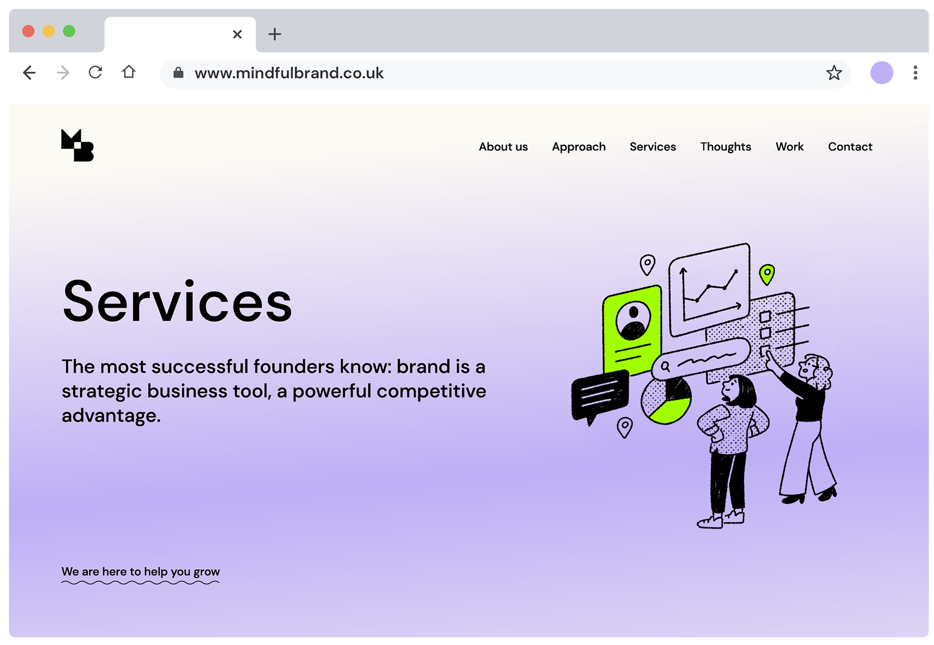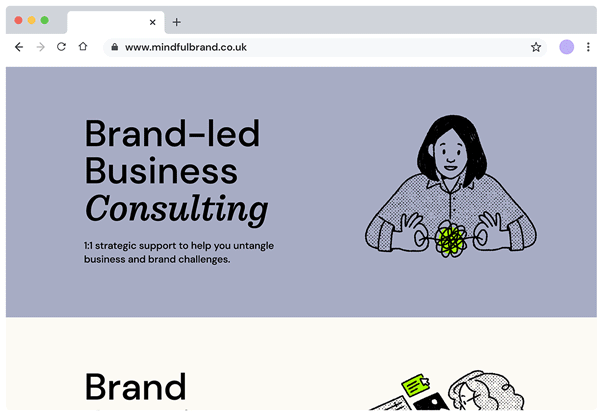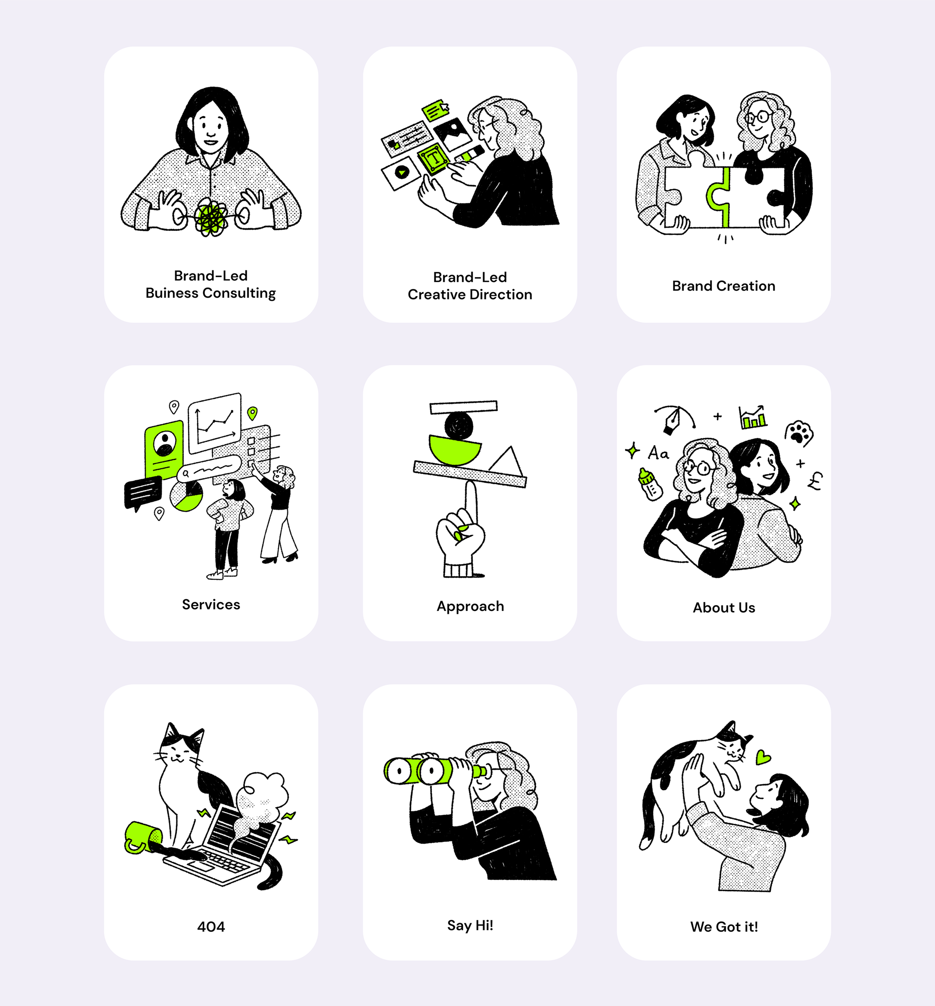 Spot illustrations and icons created for Mindful Brand, a female-led business brand consultancy. The illustrations were designed to accompany various sections of their website, visually reinforcing the brand’s personality and values. My focus was on capturing the specialities of the two co-founders and creating human characters that resemble them, adding a personal and authentic touch to the visuals.