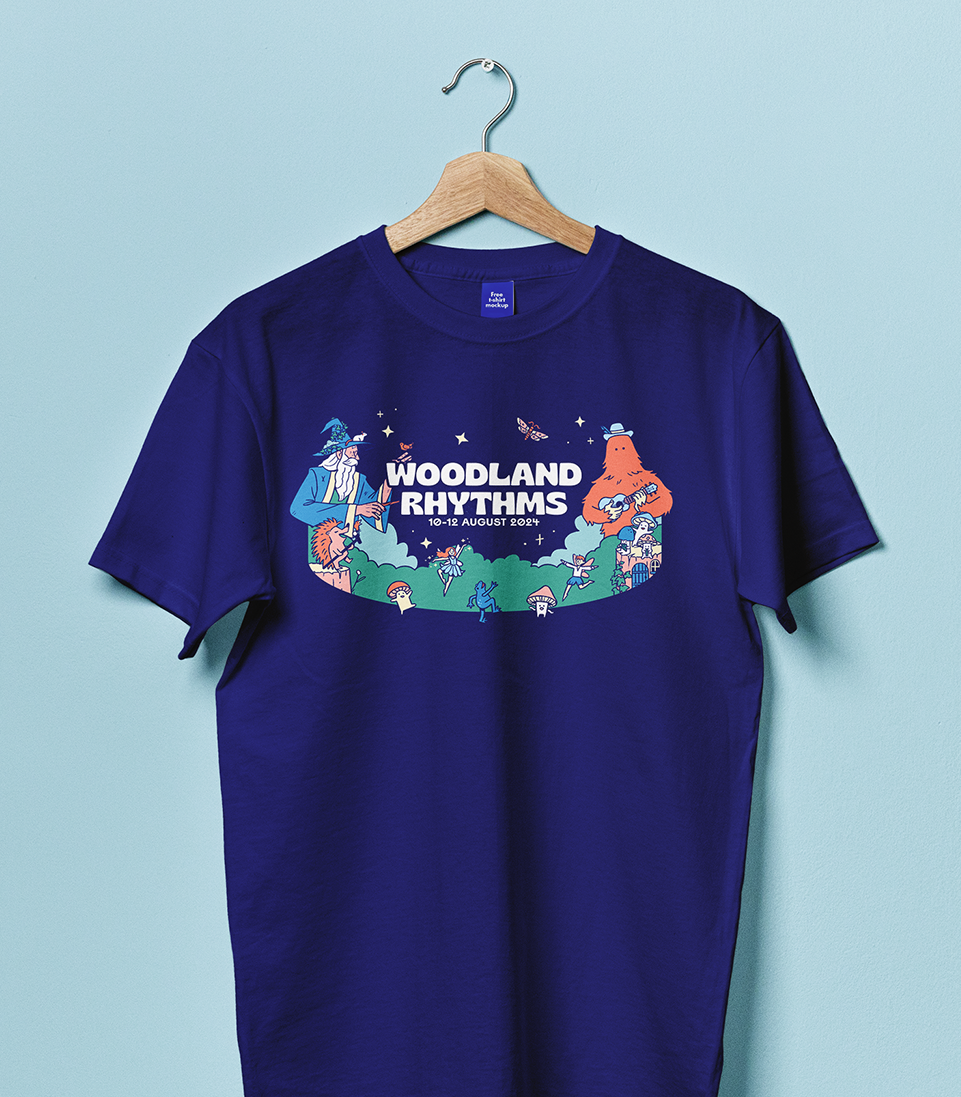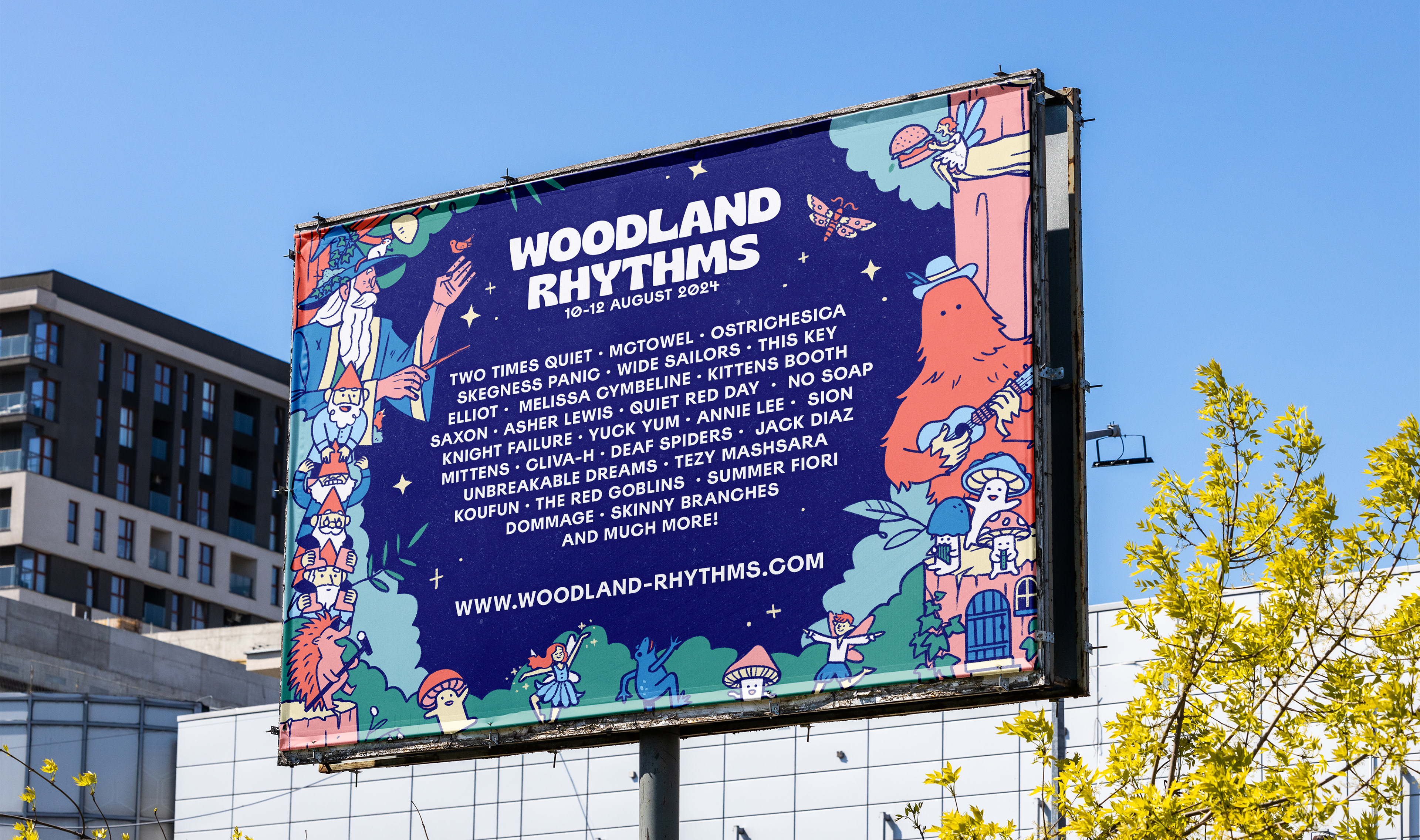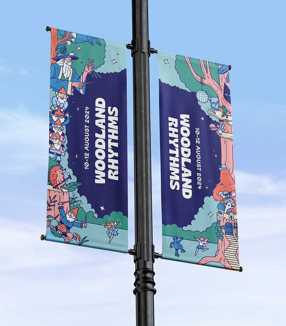 Illustrated poster and designed assets for a fictional music festival, created as part of a self-initiated project. The characters were designed with a whimsical, woodland magic theme in mind.
